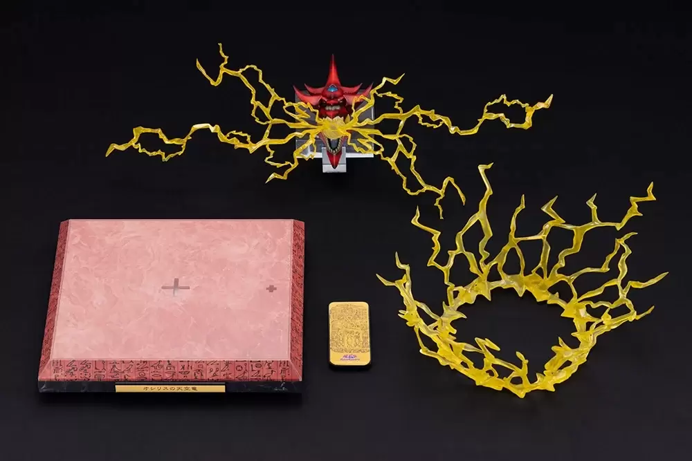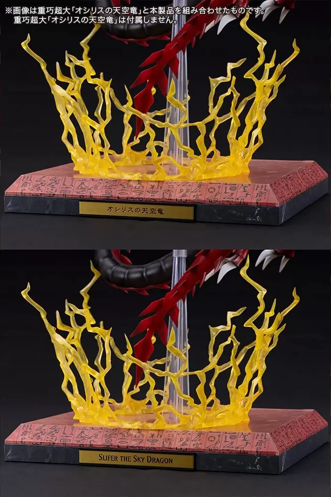 此次推出的擴充配件包含了從口部發射「超電導波雷霆之力」特效的頭部替換零件、圍繞在天空龍身旁的閃電特效、具備 LED 燈發光機構的專用臺座、印有日英語名稱的鋁製名牌、法老王記憶石碑造型的遙控器,搭配另售的「重巧超大 歐西里斯的天空龍」本體就能展示出發射「超電導波雷霆之力」的魄力場景!