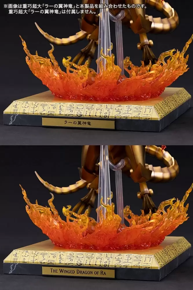 此次推出的擴充配件包含了從口部發射「神炎加農砲」特效的頭部替換零件、圍繞在翼神龍身旁的火焰特效、具備 LED 燈發光機構的專用臺座、印有日英語名稱的鋁製名牌、法老王記憶石碑造型的遙控器,搭配另售的「重巧超大 太陽神的翼神龍」本體就能展示出準備發射出「神炎加農砲」的魄力場景!