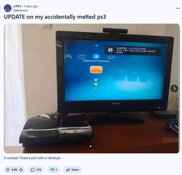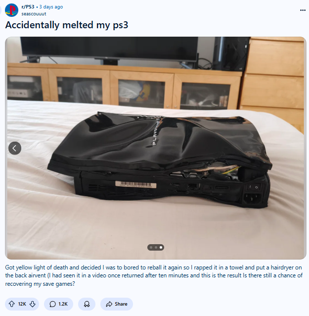 這次爆紅的 Reddit 網友 seascouuut 表示,某天他的 PS3 遇上了俗稱「YLOD(黃燈死機)」的狀況,也就是主機燈號閃黃光,代表硬體故障。這種問題通常跟主機內部焊點異常有關,網路上也有不少分享「加熱基板」的 DIY 修復法。
