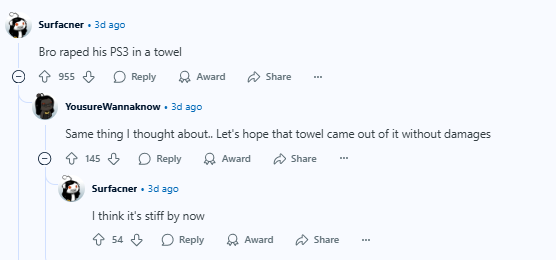 網友也恭賀他運氣爆棚,居然還可以玩,但別再「rape」它還包著那該死的毛巾阿 www。只能說這奇葩維修變成網路笑料,這名網友也奇蹟的保存了自家的 PS3,真的是天選之人啊 ( ? )。