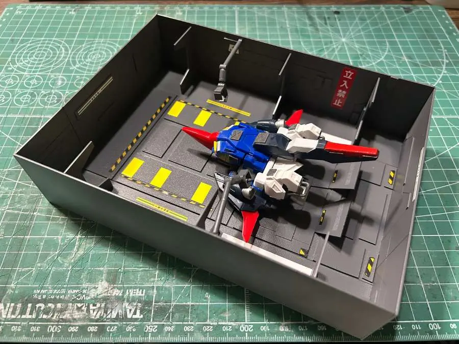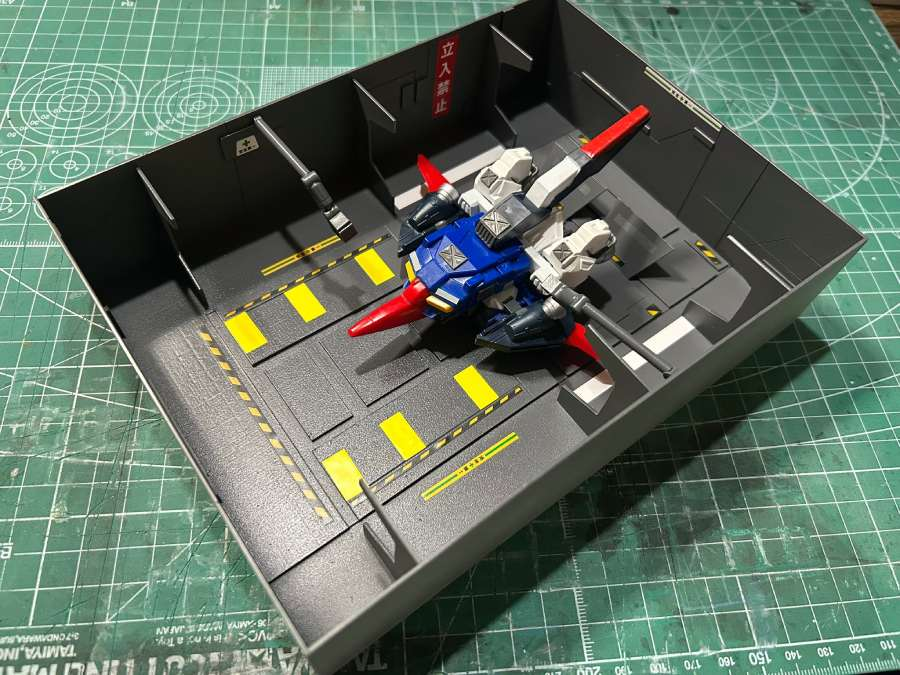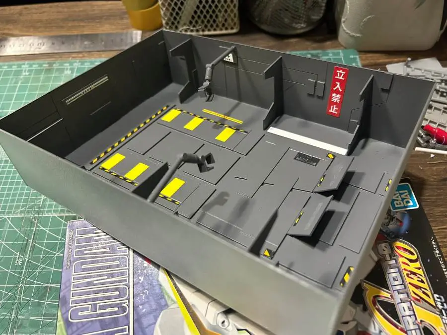 做法也很單純:先在盒子內側用塑膠板做出大致的格納庫結構,再加上機械手臂等細節,營造「格納庫的氣氛」;之後發揮想像力,加上配電盤等小裝飾,最後上色+貼紙收尾。