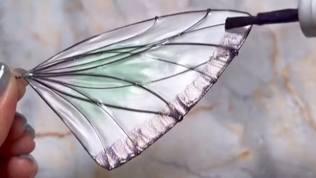 上色的部分則用了指甲油,一層一層細心上色,還用了帶亮粉的指甲油來製造閃耀感。翅膀邊緣的藍色圓點,則是用 UV 樹脂做成小顆粒,再刷上珠光粉後貼上去,閃亮又逼真。