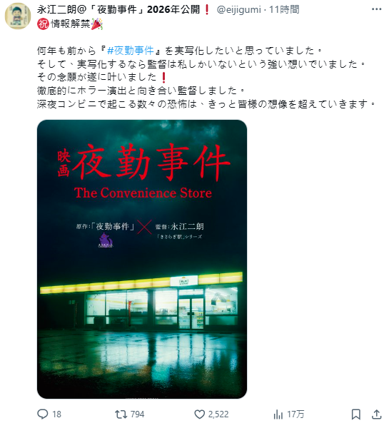 導演永江二朗表示:「我從好幾年前就想拍《夜勤事件》真人版,一直覺得這部作品只能由我來執導。這次終於能實現願望,我把所有心力都投注在恐怖演出的細節,希望觀眾能體驗到超乎想像的深夜恐懼。」