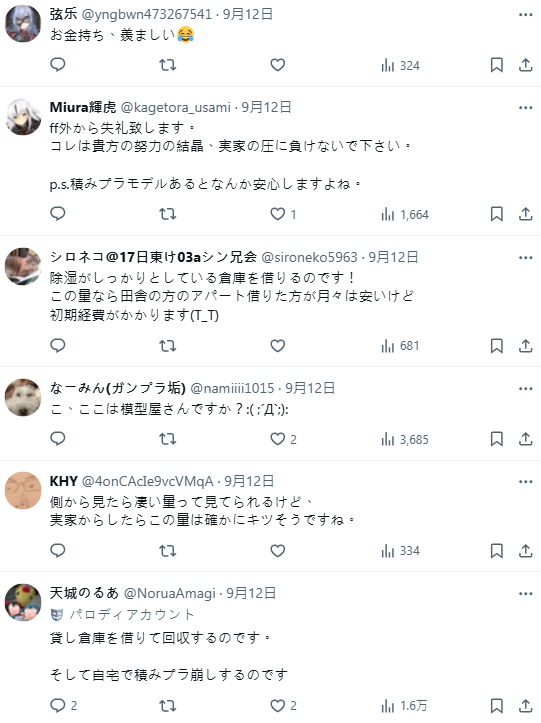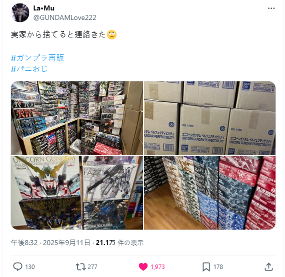 近日日本 X 上有一位推主,因為買了太多鋼普拉模型堆放在老家 ( 應該是父母家中 ) ,被通知再不處理就要丟光了,這件事情分享在網路上後也引起網友討論,對於這樣的山積狀況到底該如何解決跟應對家人的困難。