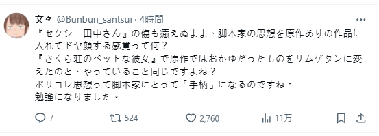 但是她這樣的自行解釋,還將原作的劇情當作一種「多餘的東西」,被不少網友認為根本不尊重原作,還自行解釋作品後拿來說得頭頭是道,過去才出現漫畫《SEXY田中小姐》改編日劇所引發的悲劇,讓人困惑為何腳本家都不能好好的尊重原作者,反倒拿來當作「自己理解更好」來說嘴。