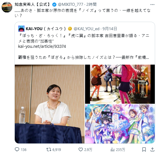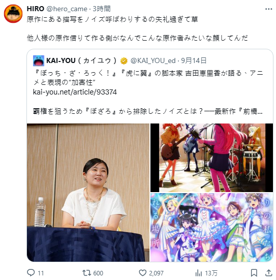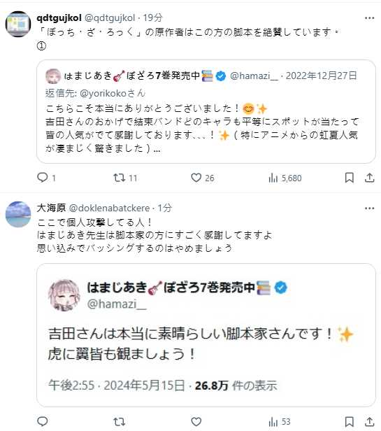 不過也有網友指出,作者濱路晶(はまじあき)其實一直都很感謝擔綱動畫系列構成的吉田惠里香,認為是用詞上有問題,並非她真的不尊重原作去進行作品解釋改編。