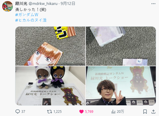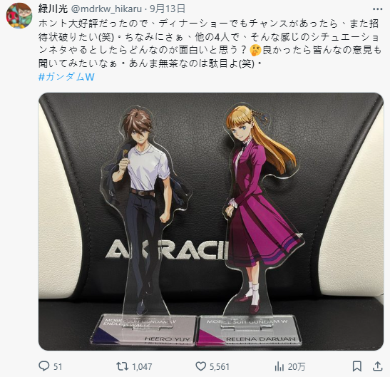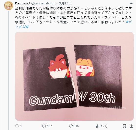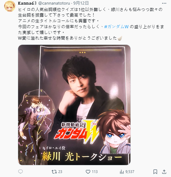 除了能看出綠川光真的非常寵粉,也盡力滿足前來參加活動的粉絲,今年開始使用 X 後也在社群上很活躍。另一方面,《新機動戰記鋼彈W》30 周年的氣勢,真的看出這部作品的人氣到現在還是相當可觀,粉絲也是長久支持。或許之後有機會,還能看到主角群更多聲優類似的實體活動。