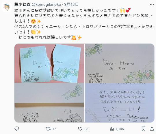 她還表示,一開始是用抽選的方式入場,但因為帶著邀請卡的人太多了,綠川光就說「既然都來了,不如多撕幾張吧」,結果最後他還親自走到觀眾席,幫大家撕了好多邀請卡。還說「只要是W的活動,不管再忙都會全力參加」,而且一直很積極地給粉絲回饋,對作品的愛跟對粉絲的用心真的讓人超感動!