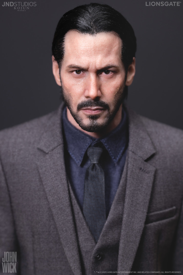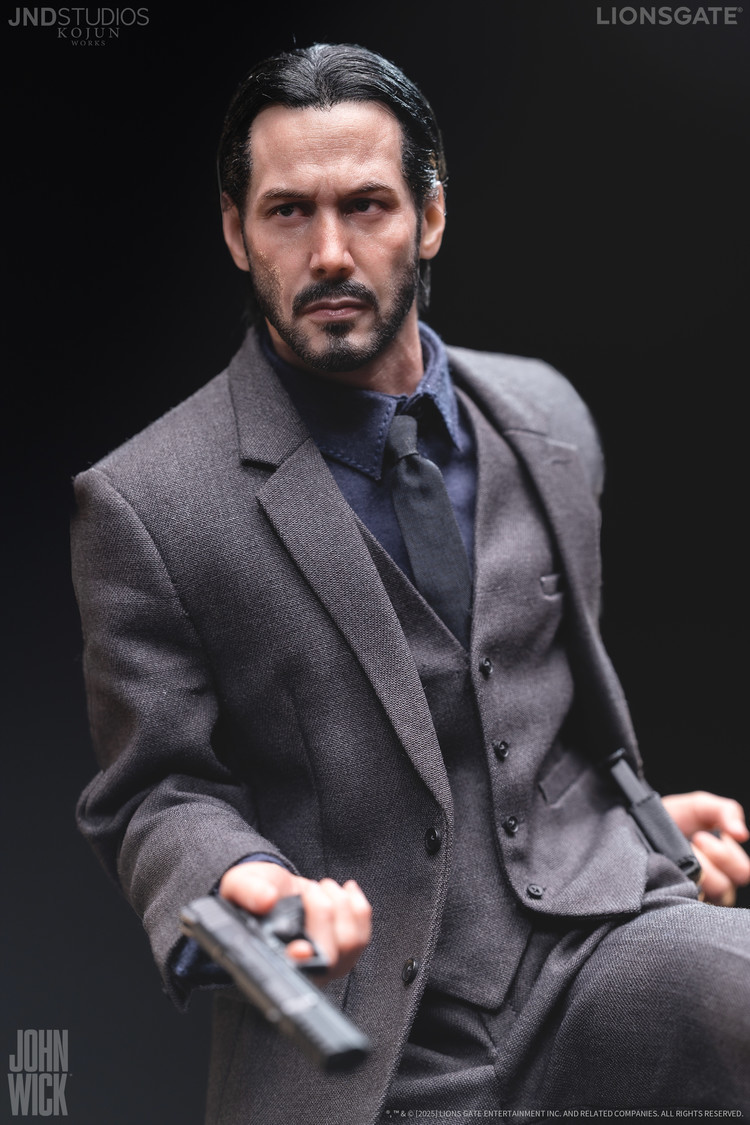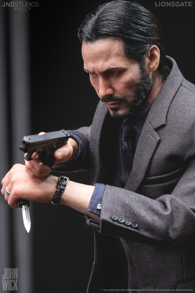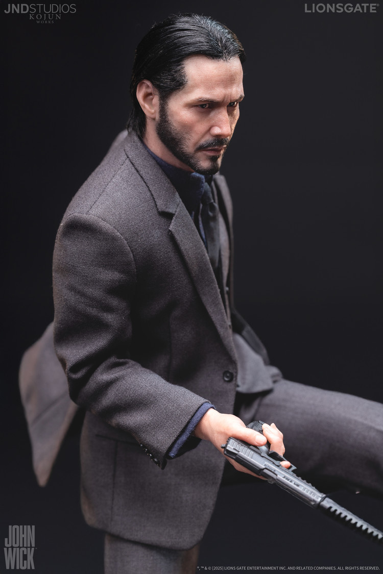 JND Studios「約翰·維克(JOHN WICK)」1/6比例可動人偶,尺寸高約 35 公分,由寫實臉部雕刻家 KOJUN 操刀,以高水準的製作技術生動再現基努李維在《捍衛任務》劇中的殺神形象,採用矽膠皮膚與先進的新型繪畫技術,精湛地刻劃出基努李維的神韻;手工植入的高仿真的髮絲等高規格製作,使其更加栩栩如生,完美地展現傳奇電影系列令人難忘的氛圍。