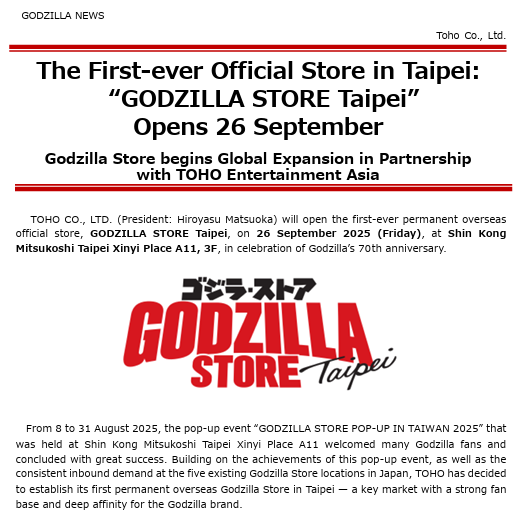 這次的海外拓點,是東寶推動哥吉拉品牌亞洲戰略的第一步。東寶將透過設立於新加坡的 TOHO Entertainment Asia Pte. Ltd.,積極推廣品牌在亞洲的發展。從台北起跑,未來還計劃把哥吉拉專賣店網路拓展到更多亞洲城市,進一步提升品牌價值與影響力。