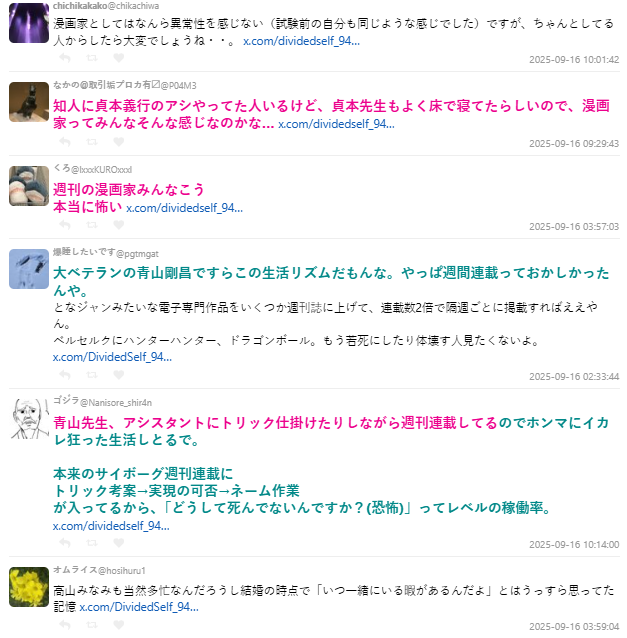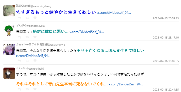 不少網友分享漫畫家作息的普遍情況,有人說「週刊漫畫家幾乎都是這樣的作息,真的可怕」、「連青山老師這種大前輩都是如此,週刊連載真的是超高強度」,甚至有人提到有朋友擔綱貞本義行的助理,也常在地板上睡覺,幾乎在漫畫界工作這樣已經是常態。