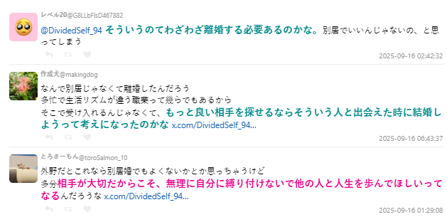 有網友指出,生活作息不合對夫妻生活影響巨大,「夫妻原本應該互相扶持,但作息不同,壓力累積下來,感覺回家像和陌生人同住,不如單獨生活輕鬆」。有人則認為,這種情況可能分居就足夠,但若對彼此仍重視,選擇離婚也是讓雙方能找到更適合的生活方式。