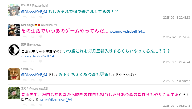 此外,網友也注意到青山老師的遊戲嗜好,除了漫畫連載,還會玩《艦隊收藏》和《動物森友會》,有人感嘆「漫畫、電影作畫、遊戲都兼顧,根本不像人啊」。