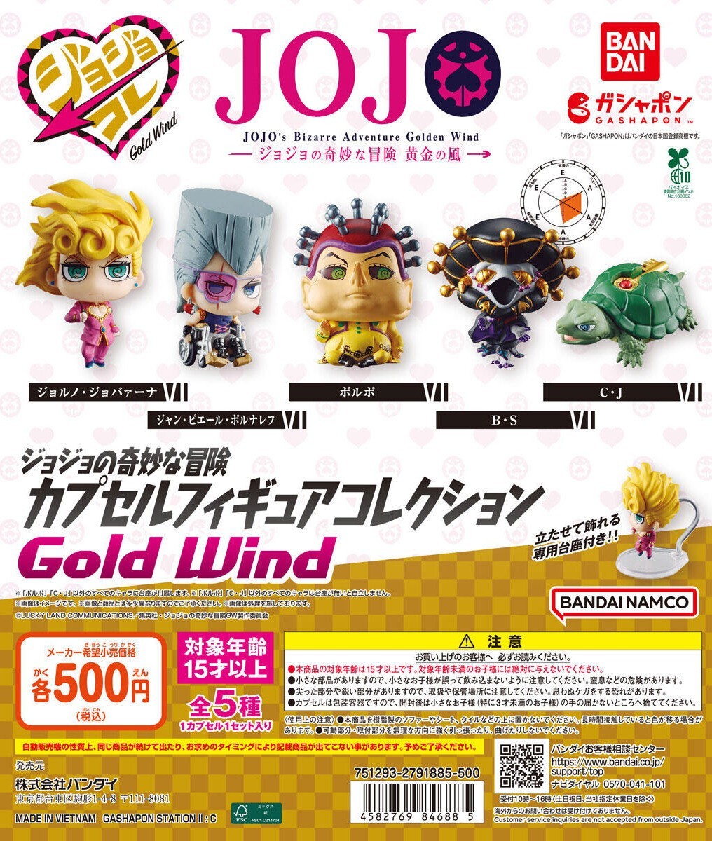 日本 BANDAI萬代玩具公司(株式会社バンダイ)旗下轉蛋事業部 GASHAPON 推出的《JoJo的奇妙冒險 》「角色人物收藏」系列,將以《黃金之風》為主題,推出最新商品:「JOJO的奇妙冒險 角色人物收藏轉蛋 GOLD WIND」,一共有五種款式,一轉參考售價為 500 日圓,預計將於 2025 年 10 月開轉。