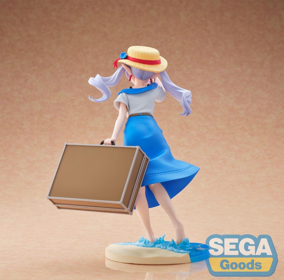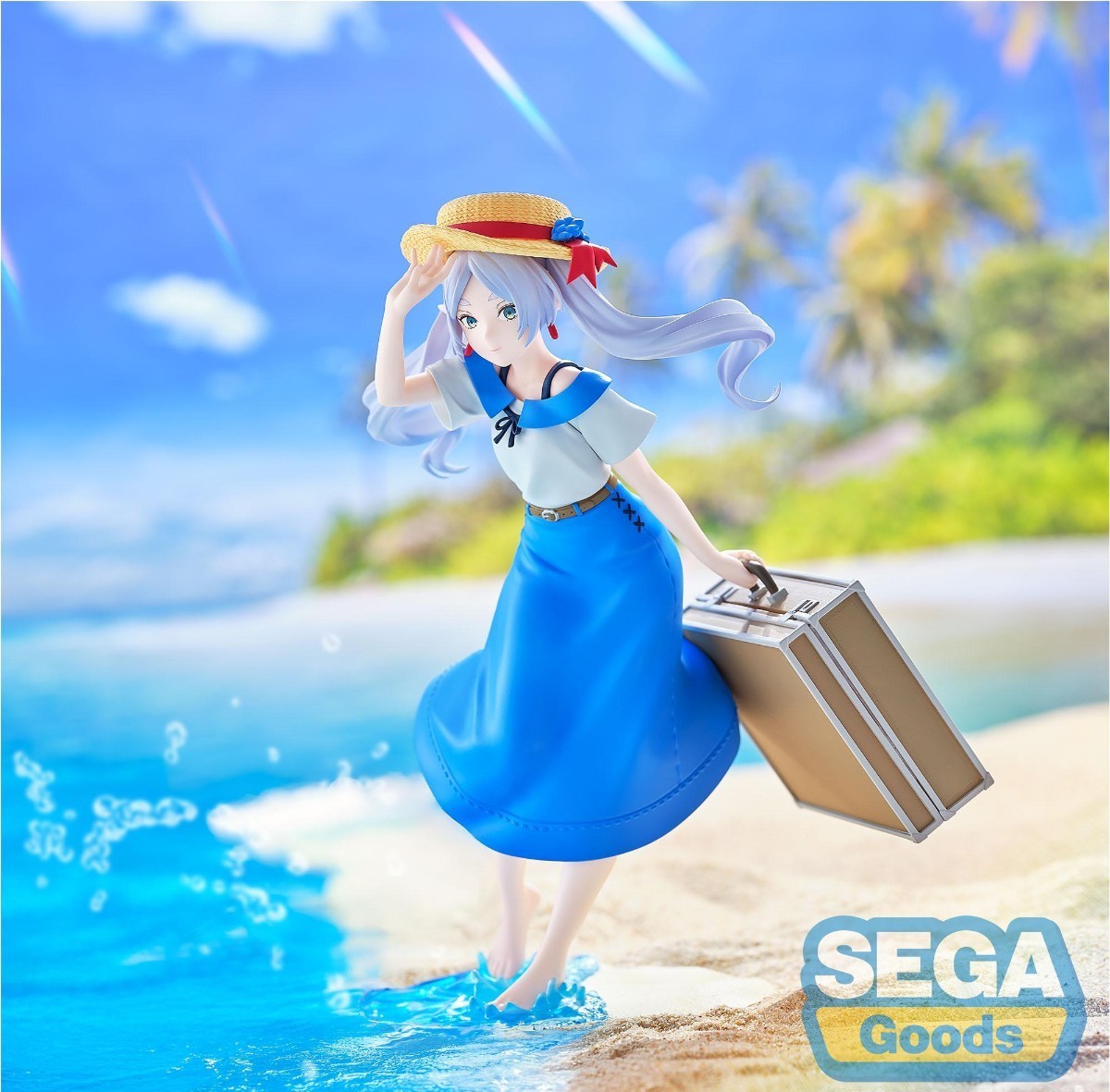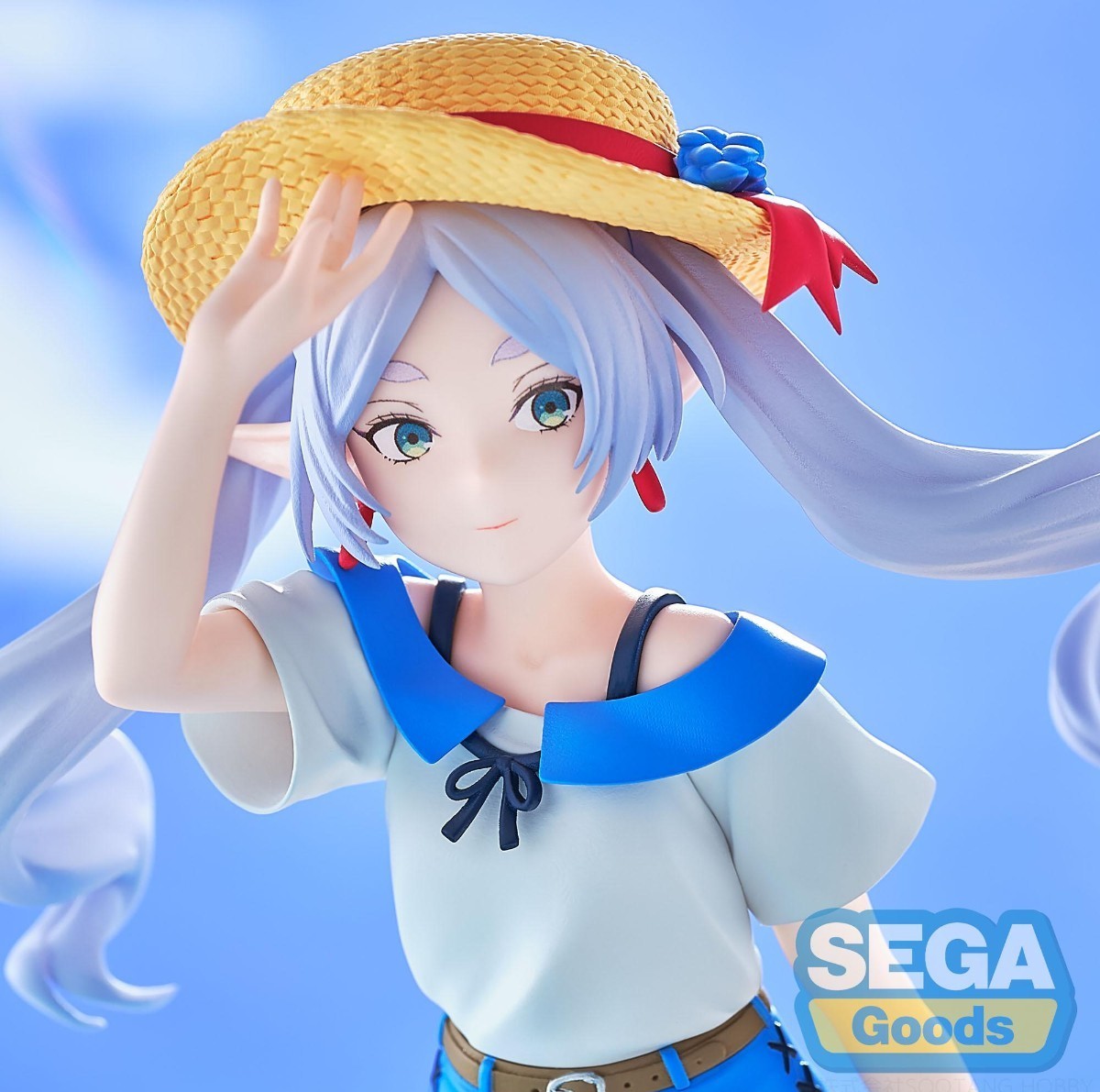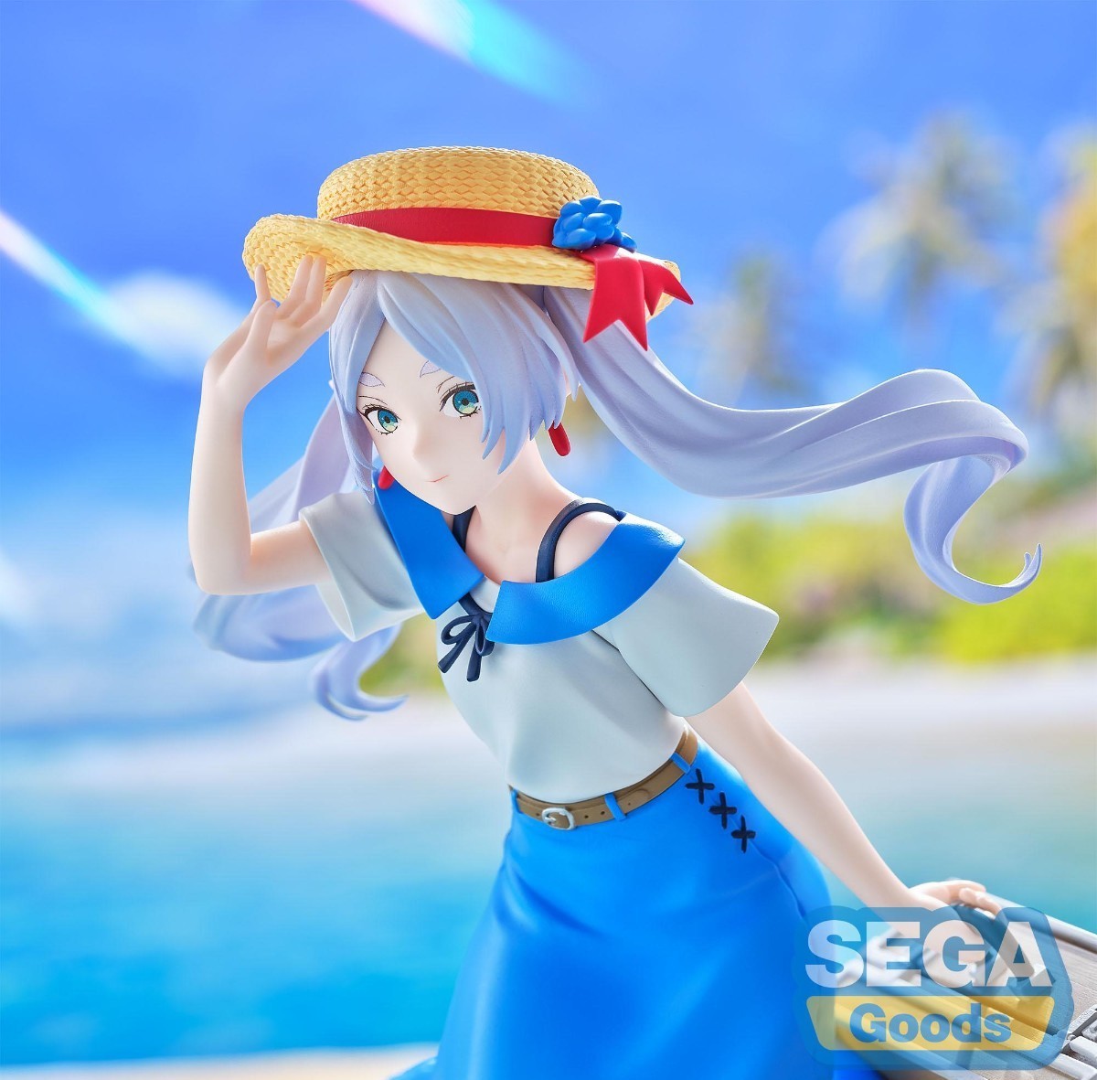 SEGA PRIZE景品「Luminasta 芙莉蓮~SUMMER DRESS~」,尺寸約高 20 公分,讓芙莉蓮換上可愛的夏日風格服裝,呈現出在海邊踏浪的造型。清爽的藍白配色上衣與長裙飄逸,搭配仔細刻畫細節的紅緞帶草帽,讓千年精靈洋溢著青春氣息;手中提著大大的行李箱,另一手則是輕撫著帽沿,底座透過透明零件呈現出浪花打在腳上的動態感,整體造型十分生動!