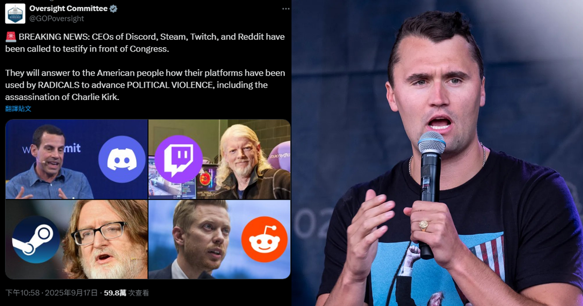 美國保守派行動派人士查理·柯克(Charlie Kirk)本月在猶他州遭槍擊身亡,事件震驚全美。如今,矛頭指向多個線上平台。眾議院監督委員會主席、共和黨籍議員詹姆士·卡莫(James Comer)宣布,Discord、Reddit、Steam 與 Twitch 的執行長已被傳喚,將於 2025 年 10 月 8 日出席聽證會,說明平台在防止使用者激進化與政治暴力方面的責任。