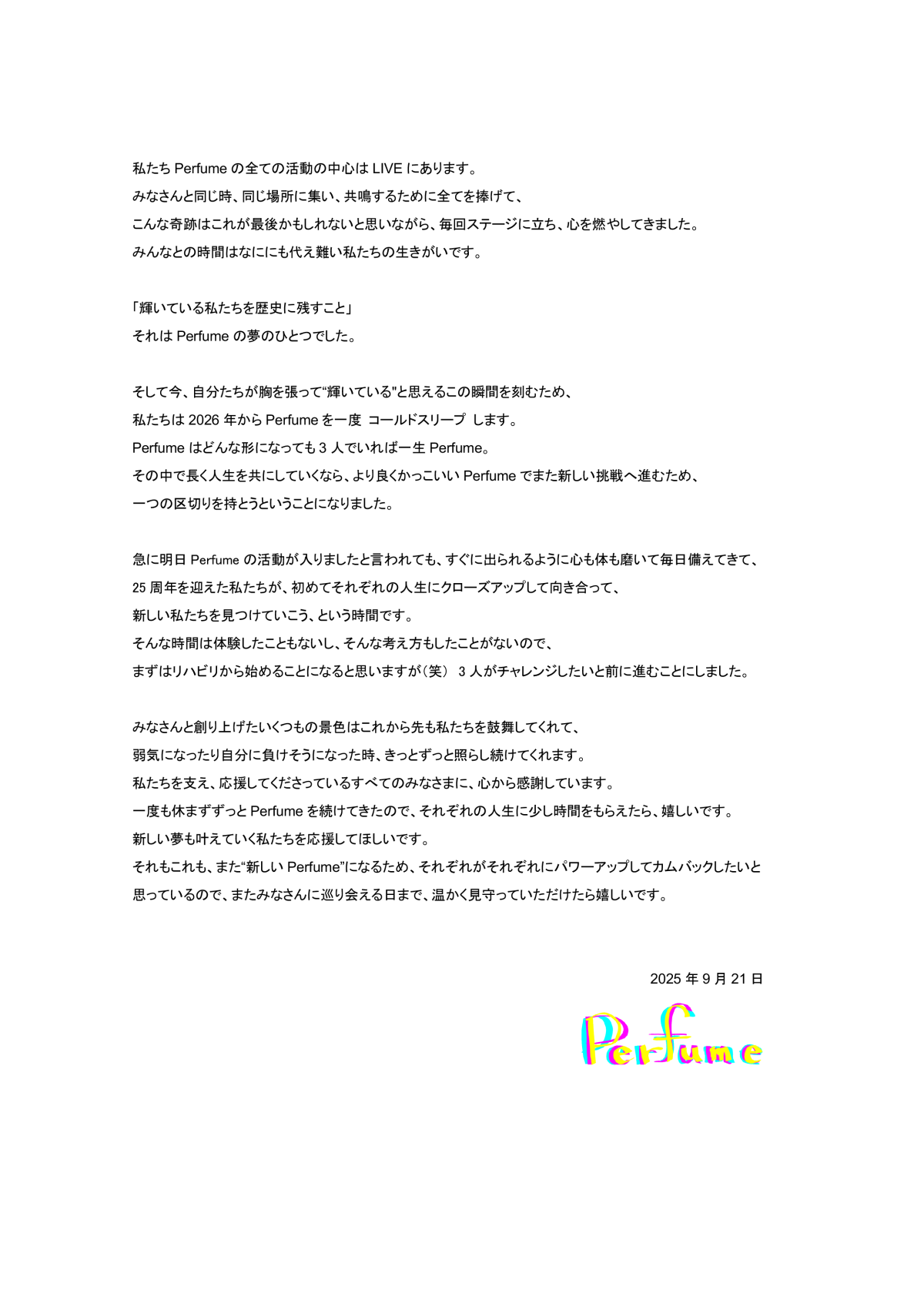一路以來 Perfume 從未休息過,這次能有一點時間留給各自的人生,對我們來說是很幸福的事。希望大家也能支持我們去實現新的夢想。而這一切,也是為了將來能變成「全新的 Perfume」。我們三個人都想要讓自己變得更強、更有力量,然後再回來。所以直到再次和大家相遇的那一天,希望能得到大家溫暖的守護。