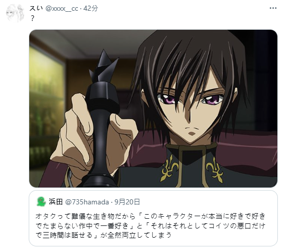 不過近日日本 X 上,有位推主提出一個疑問「我超愛這角色,但卻能無止盡吐槽他」,他發現不少宅宅都有這樣的思考,不能理解為何這種思考可以兩者並存,甚至這種角色還真不少。