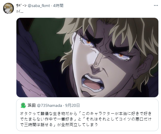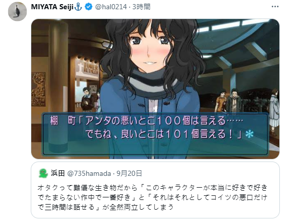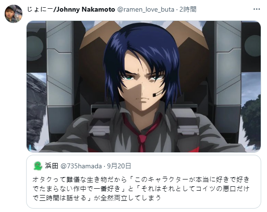 引起討論的推主發文指出,宅宅真的是一種很難搞的生物,明明可以一邊說「這角色我真的超級超級喜歡,是整部作品裡我最愛的!」,但同時又能「不過話說回來,我光是吐槽這傢伙就可以講三個小時」──而且這兩件事完全可以並存。