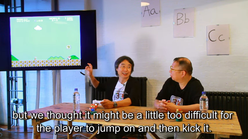 宮本強調,這樣的「課程設計」往往是在完成後面複雜關卡後才回頭製作,因為團隊需要知道玩家必須掌握哪些技能。他透露,原本 1-1 的首個敵人是烏龜兵,但因需要踢殼才能擊敗,過於複雜,於是後期才加入更直觀的栗寶寶。