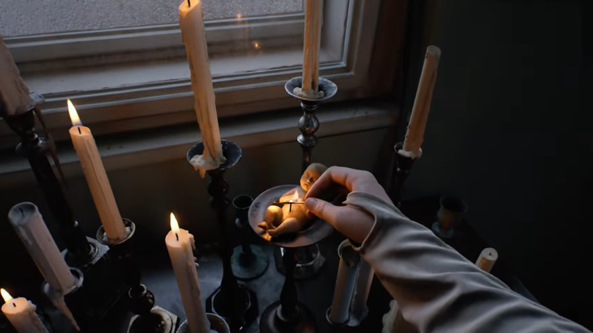 隨後,角色進入昏暗房間,窗外雨水拍打玻璃,室內擺放著一只裝滿蠟燭的木箱,其中幾支甚至呈現出《死亡擱淺》中嬰兒般的造型。隨著蠟燭被點亮,角色的恐懼逐漸加深,最後伴隨著門軸聲與蓋革計數器般的噪音,一個邪惡的身影逼近並抓住她的頭,畫面戛然而止。