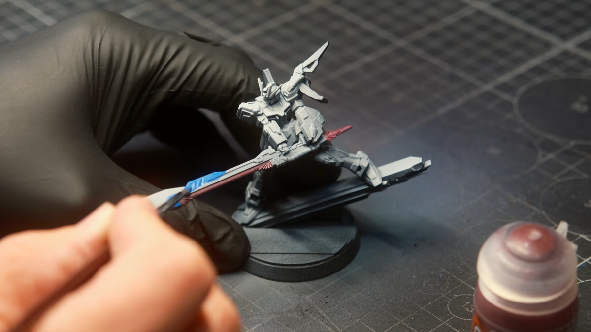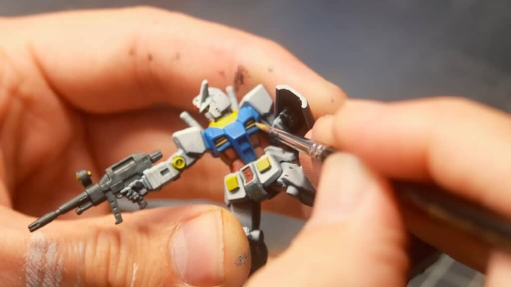 影片裡的塗裝過程更是一大亮點。他先用噴筆上底漆與基礎色,再用細筆慢慢堆疊顏色,連只有幾毫米大小的胸口散熱口都能分色精準。就算是色塊複雜的初代鋼彈,也被他細心塗到完美。