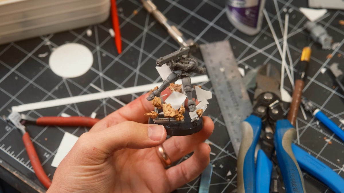 他把塑膠板拼接成殖民地殘骸,還用軟木板碎片當大地,再加上塑料與廢料零件做結構,讓底座瞬間多了臨場感。