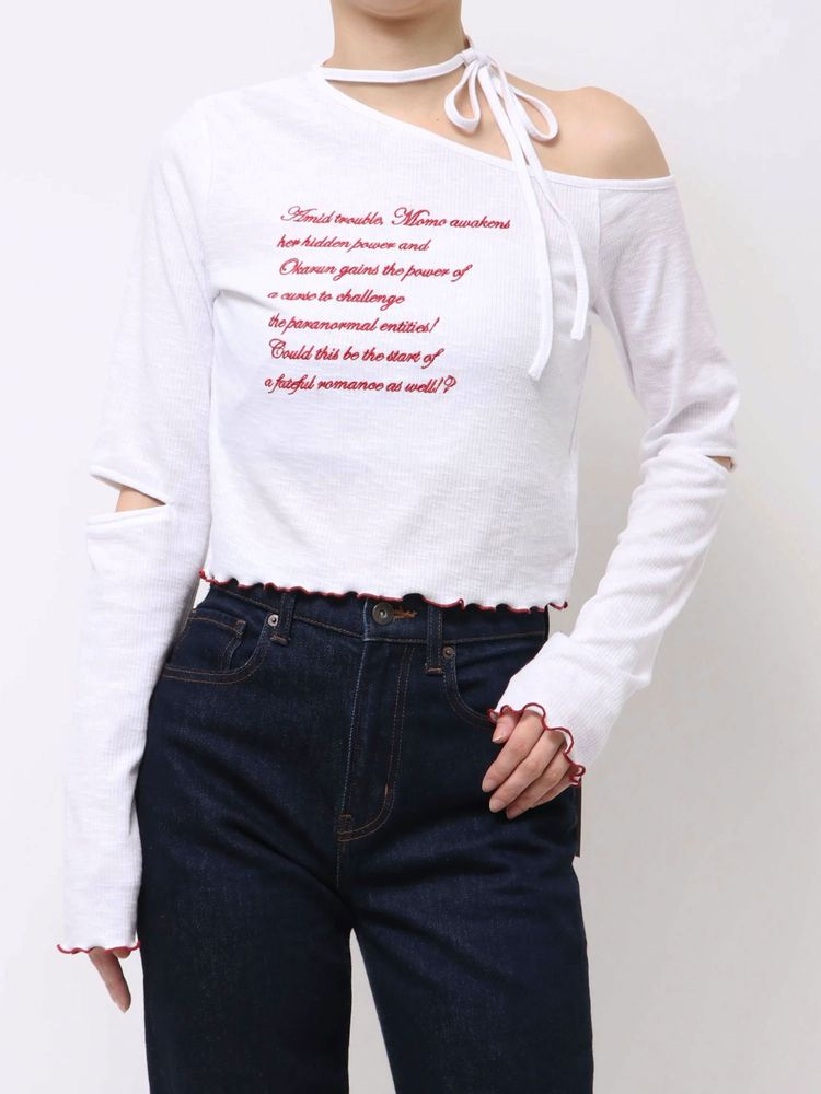 前後 2WAY 的單肩上衣,材質有彈性,可以依心情切換正反面。袖子有挖空設計,微微露膚增添小性感。