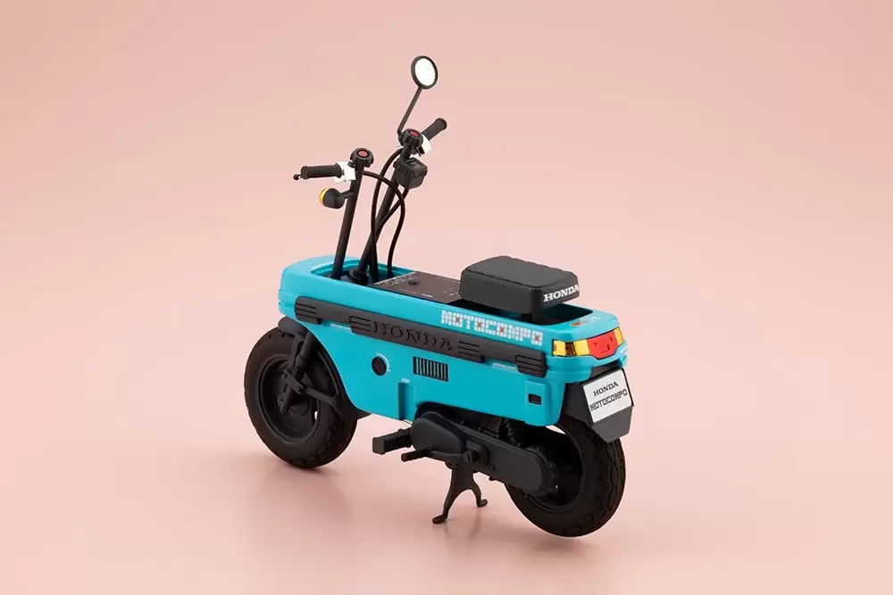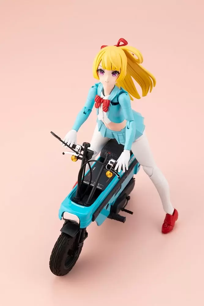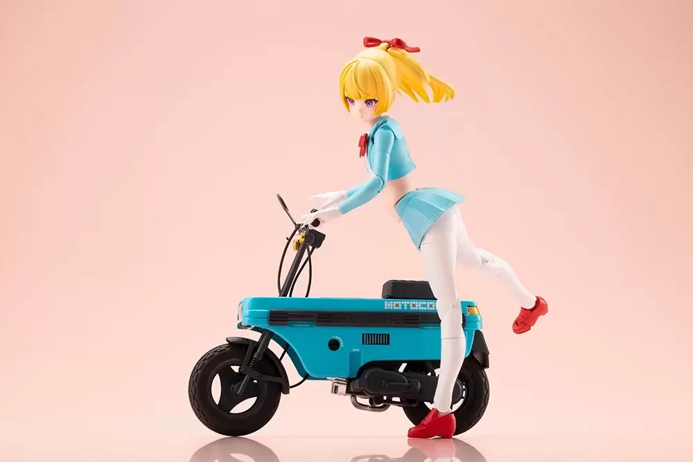 此次商品是壽屋女神裝置商品「BUSTER DOLL 騎士」與青島文化教材社製組裝模型「1/12 本田 AB12 MOTOCOMPO ‘81」的合作商品,在本田 AB12 MOTOCOMPO 本體部分是本田技研正式授權、監修的組裝模型,從外裝造型到內部結構都徹底再現這輛 1981 年推出的經典鋼琴車,同時為了此次合作賦予全新的天藍色設計、附上新規製作的輪胎和安全帽零件(需使用模型膠水組裝)。