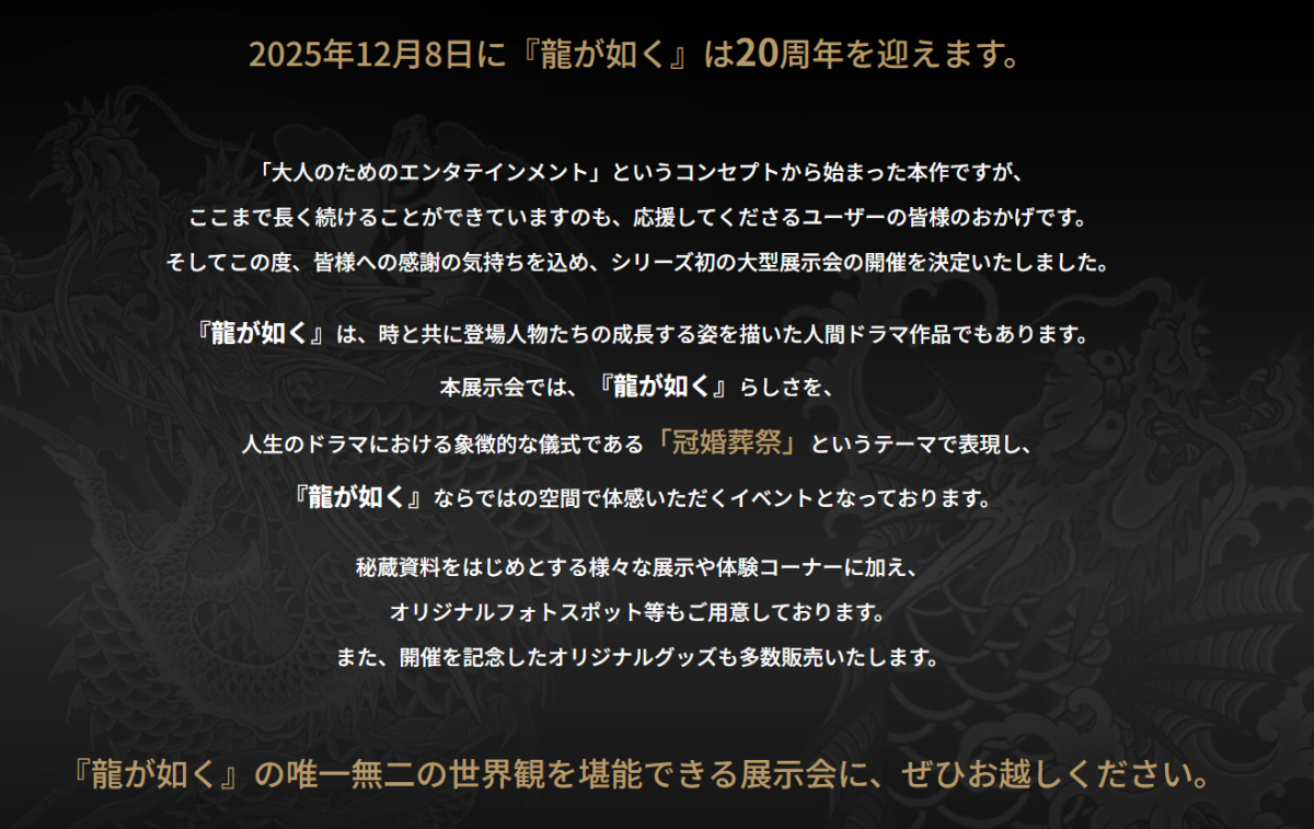 然而這遊戲系列也邁入 20 周年,SEGA 也宣布,為了紀念 20 週年,將舉辦首次大型展覽 「人中之龍 冠婚葬祭展」。活動會在東京澀谷和大阪南港舉行,整個展覽以「冠婚葬祭」為主題,推出一系列前所未有的瘋狂企劃。