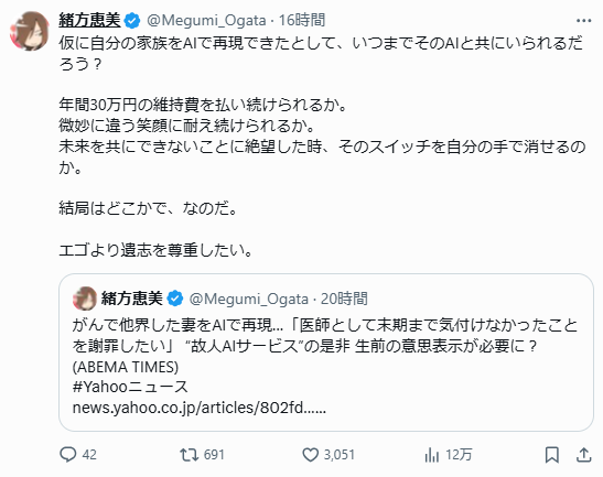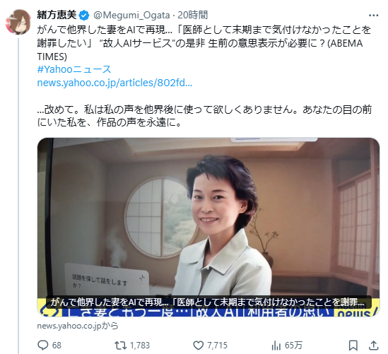 緒方引用了一篇新聞,標題是:「用 AI 重現因癌症過世的妻子…『想向她道歉自己身為醫師卻沒能及早察覺病情』 “故人 AI 服務”是否合宜?是否該在生前就表明意願?」