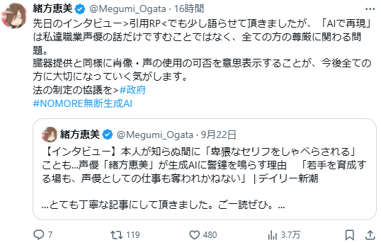 同樣聲援「NOMORE 無斷生成 AI」組織的資深聲優緒方惠美,昨日 ( 9/25 ) 在 上發文,針對「故人 AI 聲音服務」表達了自己的想法,針對聲音再現的 AI 手法表達不認同,也引起了網友關注。