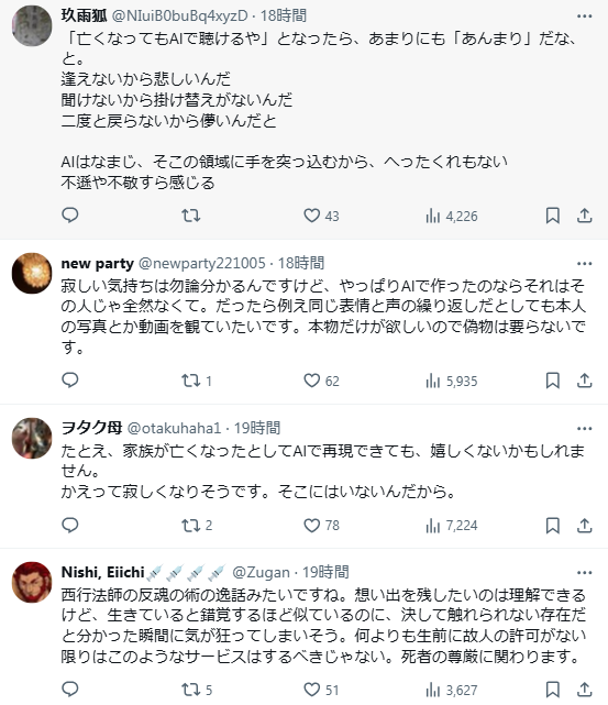 她的一連串發文引來不少迴響,也有人批評這種風氣:「現在的生成式 AI 商業已經墮落到像是盜墓,聽到只會讓人感到悲傷,甚至對亡者不敬。」對於重現故人這種作法,到底是人心太寂寞需要把亡者重現,還是純粹還活著人太貪婪,透過科技做出這樣的行為。