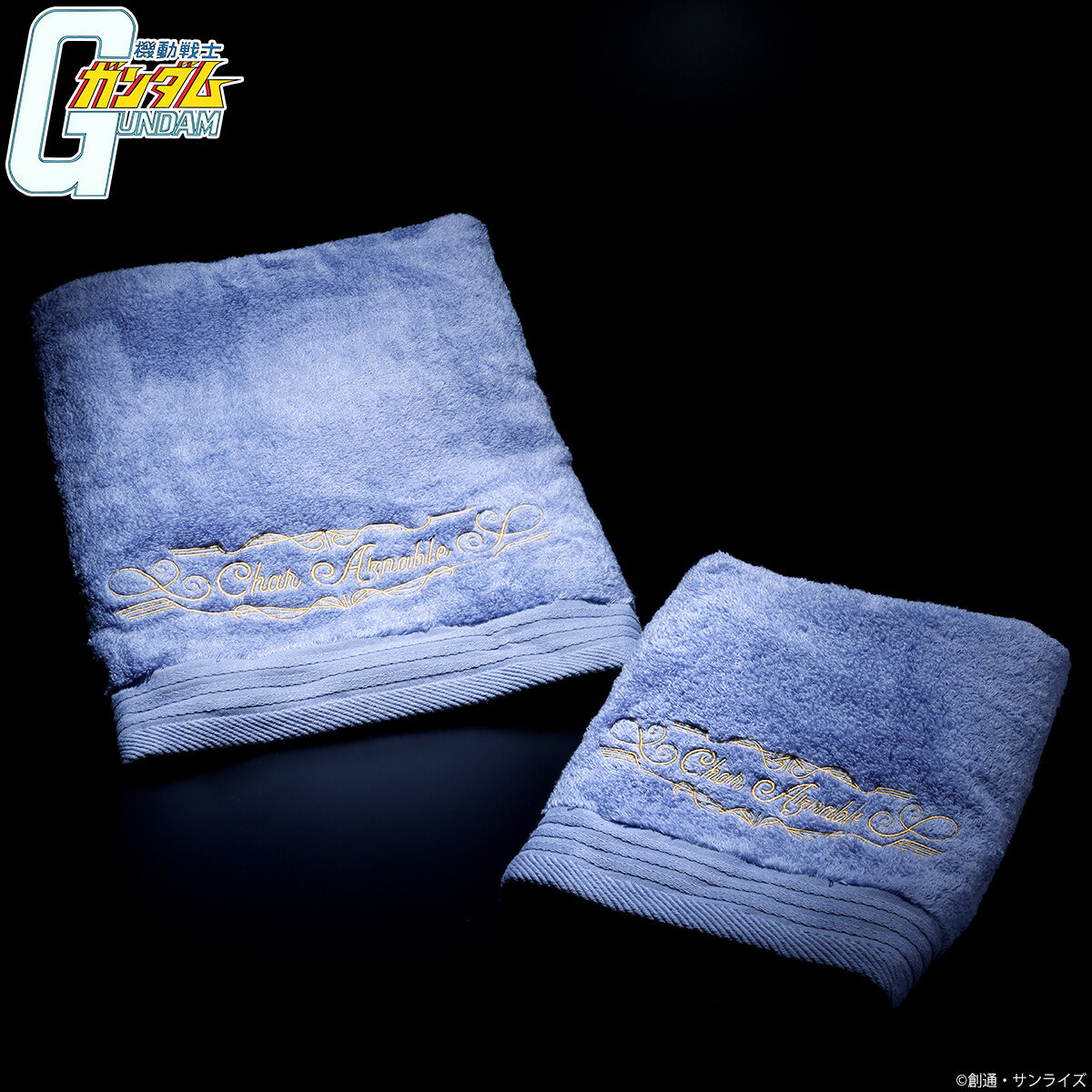 這次要推出的「機動戰士鋼彈 夏亞毛巾套組」,靈感來自劇中夏亞使用的毛巾,內容包含一條大浴巾+一條臉巾的組合。毛巾採用超細無撚紗,保留棉花原本柔軟的手感,材質有光澤感,還加上金線刺繡把夏亞的名字放上。