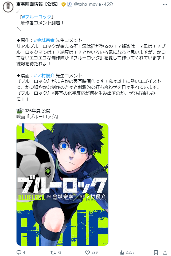 此外,原作金城宗幸老師也對真人電影表示 : 「真的要開始上演『真人版 BLUELOCK』了!大家一定都很好奇演員會有誰吧!不過我可以保證,這群前所未有、滿滿『自我主義者』的製作團隊,真心熱愛《BLUELOCK》,用全力來打造這部作品!敬請期待後續消息!」