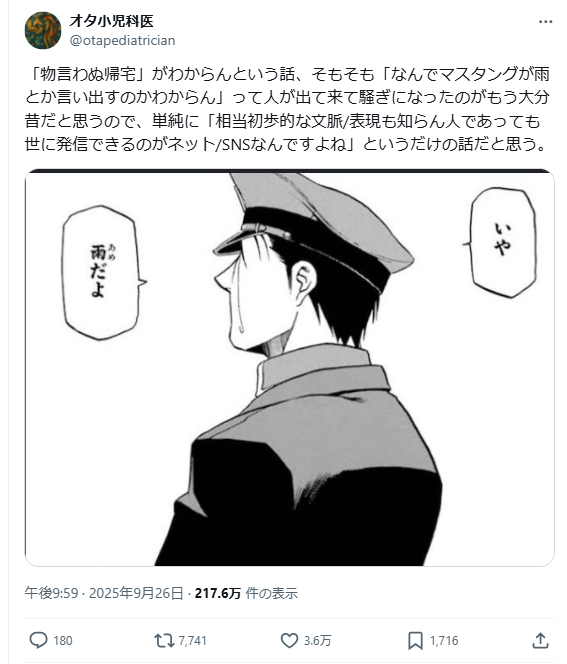 近日日本 X 上,因為有網友表示聽不懂「無言回家」( 無言の帰宅w ) 的意思掀起話題,讓推主想到當年也有人搞不懂《鋼之鍊金術師》裡面「為什麼馬斯坦古突然說下雨了」。到底是有些隱喻太難,還是情境真的太艱深無法帶入呢 ?