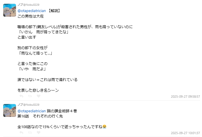 也有網友補充,馬斯坦古是會操控火焰的鍊金術師,因為遇到雨天完全派不上用場,還被人叫過「雨天廢物」。所以「下雨了」這句話,其實也有「我連部下都保護不了,真的是個沒用的人」這層含義。其實「雨=眼淚」是很古老的比喻,除了他留下的眼淚外,更是怨恨自己的無能,這層雙重意義更讓人心碎。