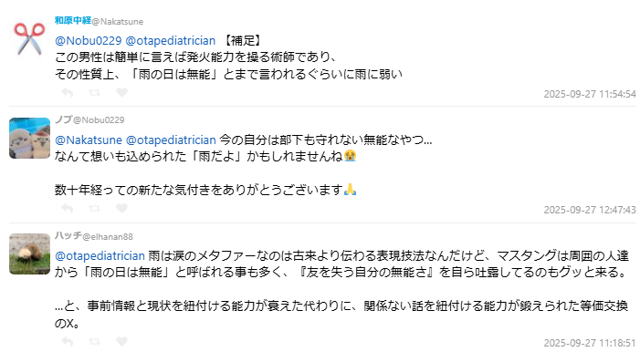另有網友就指出,想到當年也有人搞不懂「為什麼馬斯坦古突然說下雨了」。這種狀況只是說明,就算是很基礎的語境或表達,有些人還是會不懂,但因為網路/社群的關係,大家都能把這種狀況大聲講出來,因為許多人缺乏思考,就只從字面上思考就回應了。