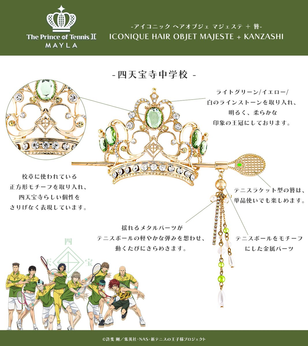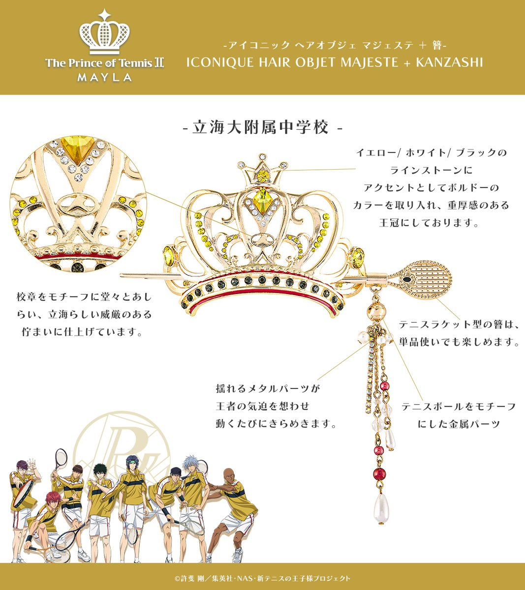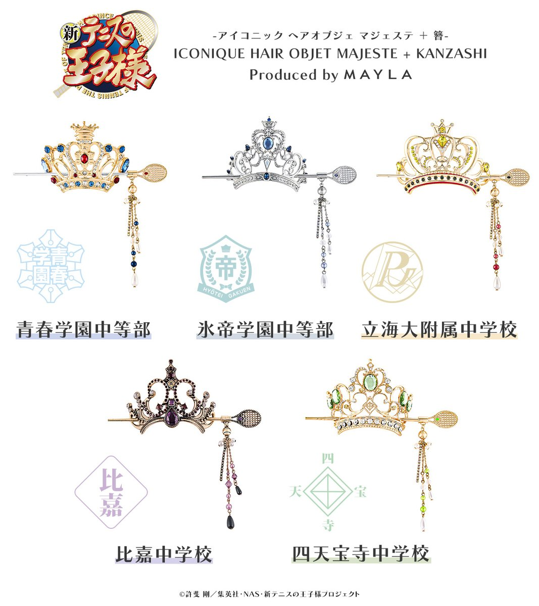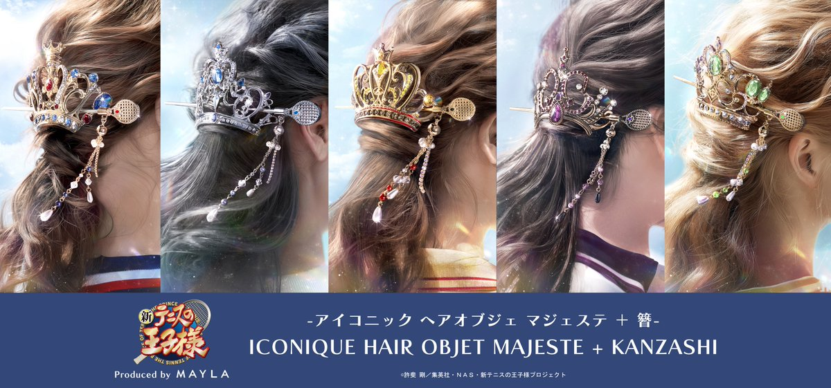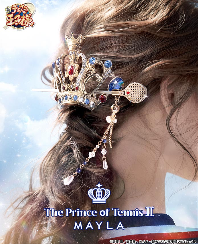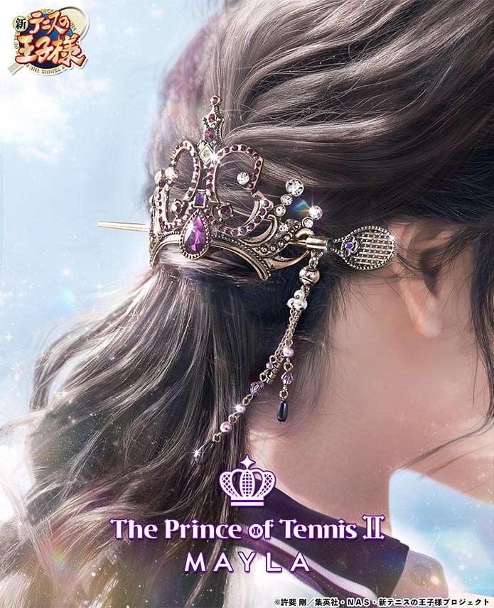 這次推出的聯名造型髮簪以《新網球王子》中五大人氣學校為靈感,包括:青春學園、冰帝學園、立海大附中、比嘉中學與四天寶寺中學,共計五種設計,每款都注入校隊服裝配色與 MAYLA 品牌時尚元素,不僅可以作為單獨的簪使用,也可與飾品組合成優雅的華麗髮飾。
