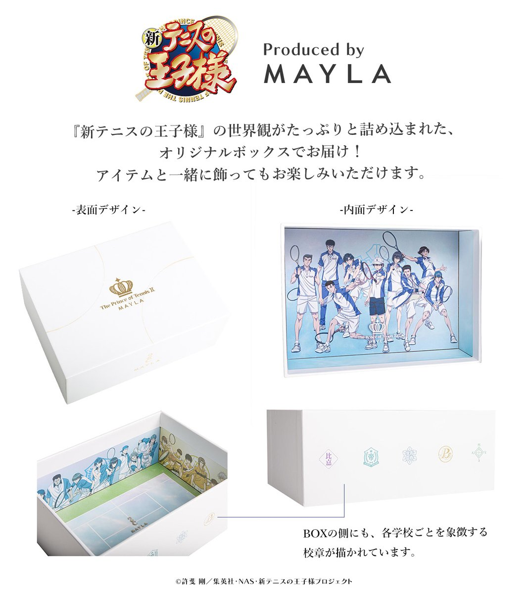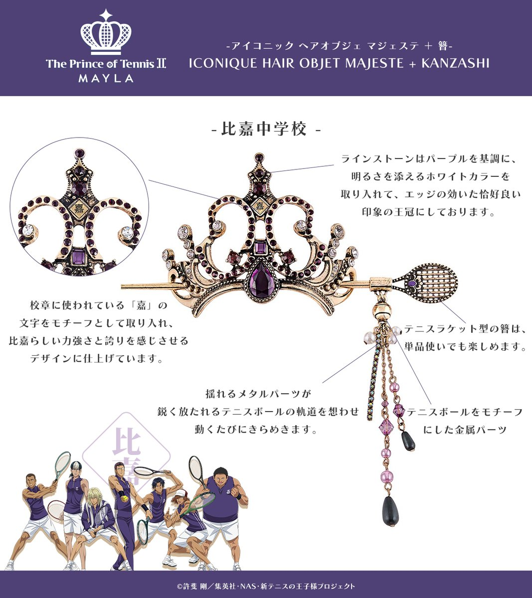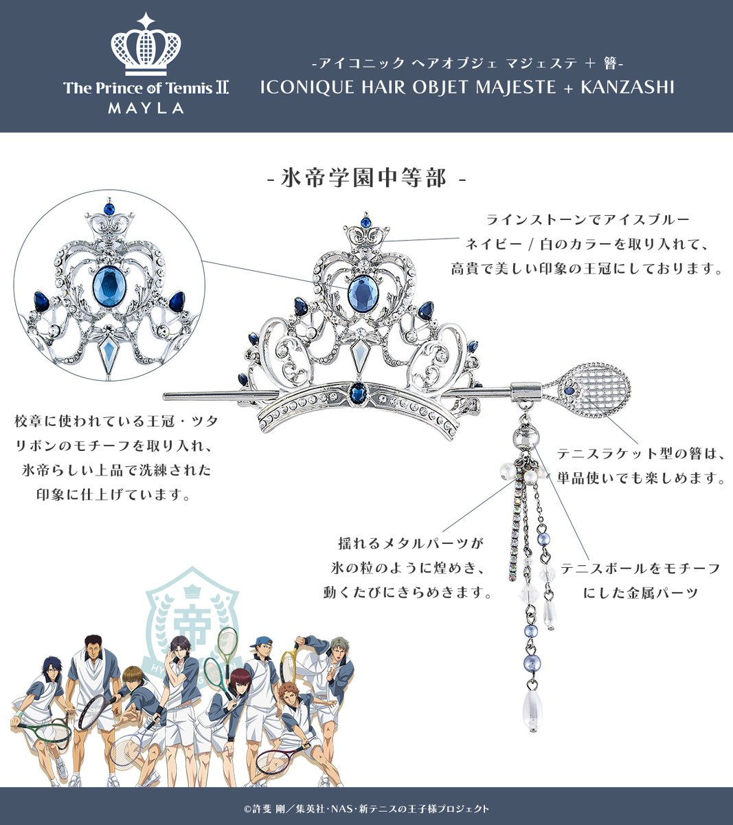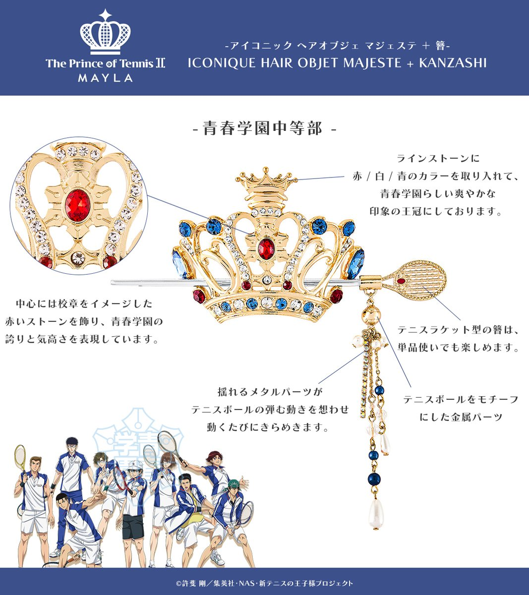 這次推出的聯名造型髮簪以《新網球王子》中五大人氣學校為靈感,包括:青春學園、冰帝學園、立海大附中、比嘉中學與四天寶寺中學,共計五種設計,每款都注入校隊服裝配色與 MAYLA 品牌時尚元素,不僅可以作為單獨的簪使用,也可與飾品組合成優雅的華麗髮飾。