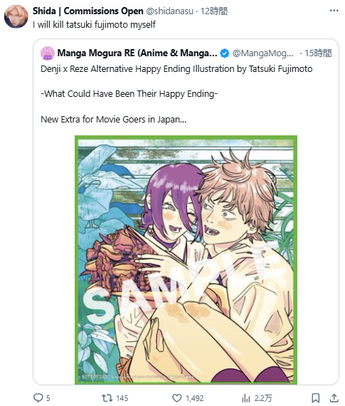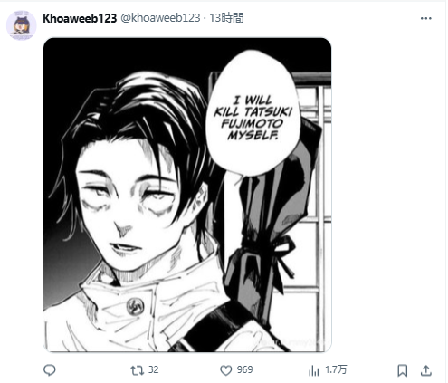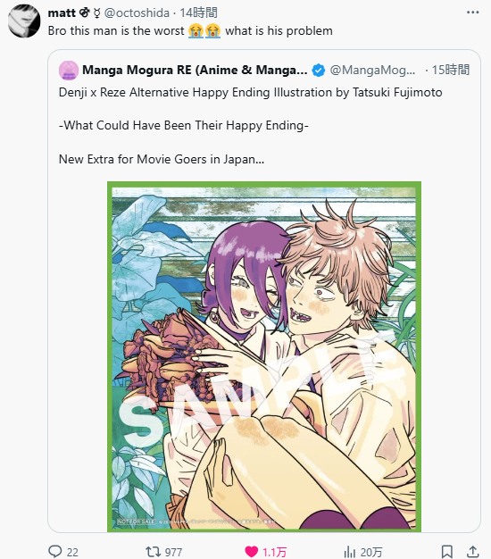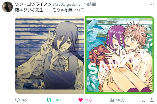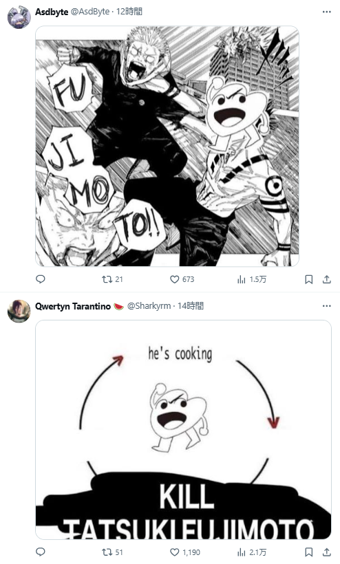 甚至連海外網友見狀也是大崩潰,藤本樹這操作雖然真的餵「另一個結局」的糖,但本質上還是讓粉絲再次心痛爆擊 QQ。還出現不少迷因梗圖,雖然都是開玩笑,不過也看得出藤本樹真的戳到不少人的心痛...。