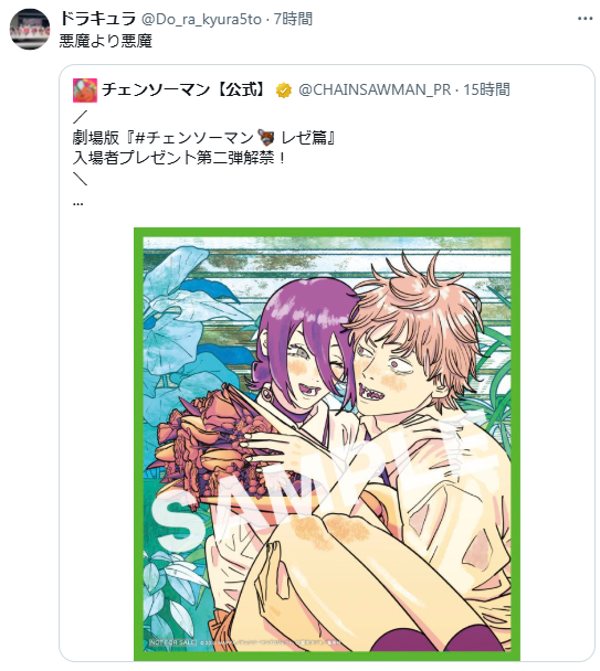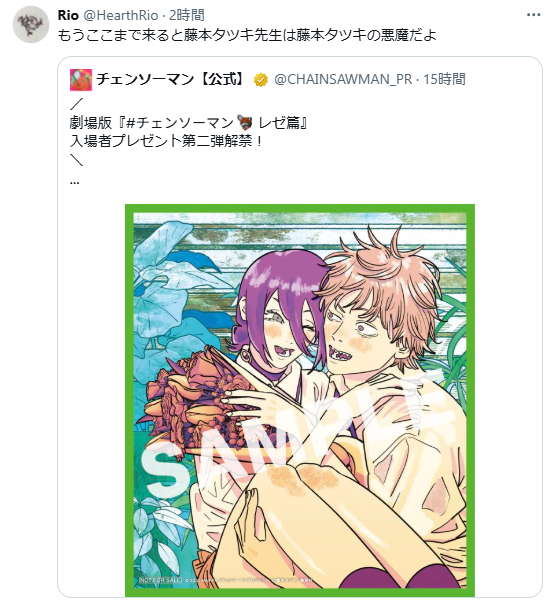 日本官方宣布了第二波入場特典。從 10 月 4 日起,觀影觀眾將能獲得原作者藤本樹特別繪製的迷你色紙風卡片,繪圖是「蕾潔收下花束被淀治抱著」的場景,瞬間也在日本 X 上掀起話題,對於藤本樹這操作表達不同看法。