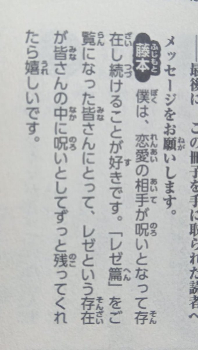 事實上,藤本樹先前也在訪談中提到 :「我其實很喜歡戀愛對象變成一種詛咒、一直存在著的感覺。希望看過『蕾潔篇』的大家,心裡能把「蕾潔」這個存在當作一種詛咒那樣,永遠留在你們心中──如果能這樣我會很開心。」,看來藤本樹的期望應該是達成了 www。