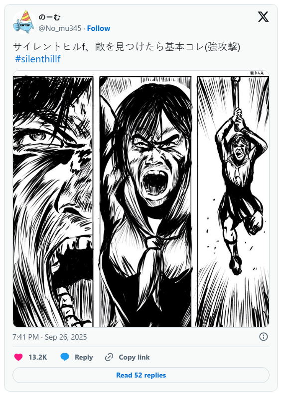 加上遊戲中宛若動作遊戲般的閃躲機制,讓玩家們讚稱雛子的戰鬥,比一般的RPG還要流暢,也有人認為「雛子才是系列最能正面硬打的主角」。這股討論熱潮,讓《沉默之丘f》在恐怖氛圍之外,又增添一層「爽快動作」的新體驗。