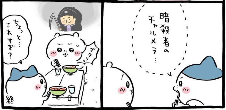 這道料理被小八取名為 「暗殺者的チャルメラ」,看到這一碗時,吉伊腦中甚至浮現「恐怖大叔死神」的畫面,感覺都要吃不下去了...。小八只好安慰說:「欸…是不是有點太恐怖啦?」故事就在這裡結束。