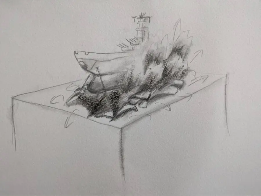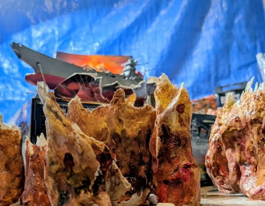 特別吸睛的是艦體周圍的白煙,使用紙黏土來塑型,粗糙的質感正好能表現爆炸火光和水花的魄力,再透過上色呈現那股強烈的氣勢。