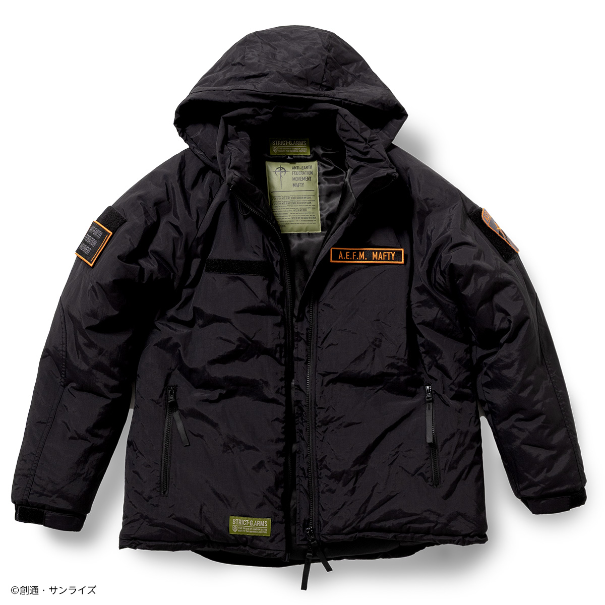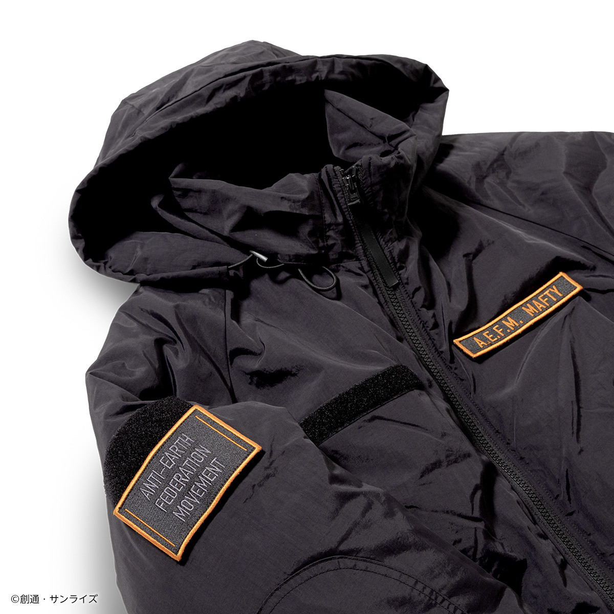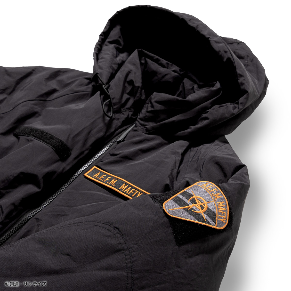 LEVEL 7 外套源自美軍 ECWCS 分層系統的最外層保暖裝備,設計能在酷寒冷冽的環境下保護身體。這次推出的版本以《機動戰士鋼彈 閃光的哈薩威》劇中反地球聯邦政府組織馬法堤為概念,整體採黑色基底,點綴代表馬法堤的橘色設計。