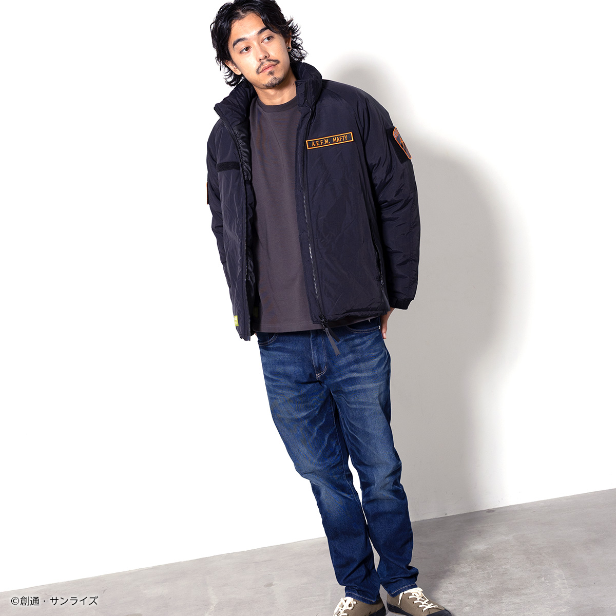 這次的版本採用輕量的棉+聚酯纖維混合材質,還有可拆式內襯,單穿或加強保暖都可以。前襟採用雙層設計(拉鍊+壓扣),有效防風防塵。背後則是標誌性的「魚尾」設計。在設計細節上,左肩有象徵吉翁指揮官的亮紅色臂章,右肩與左胸則搭配低調的橄欖綠色徽章,兼具軍事氛圍與日常搭配性。