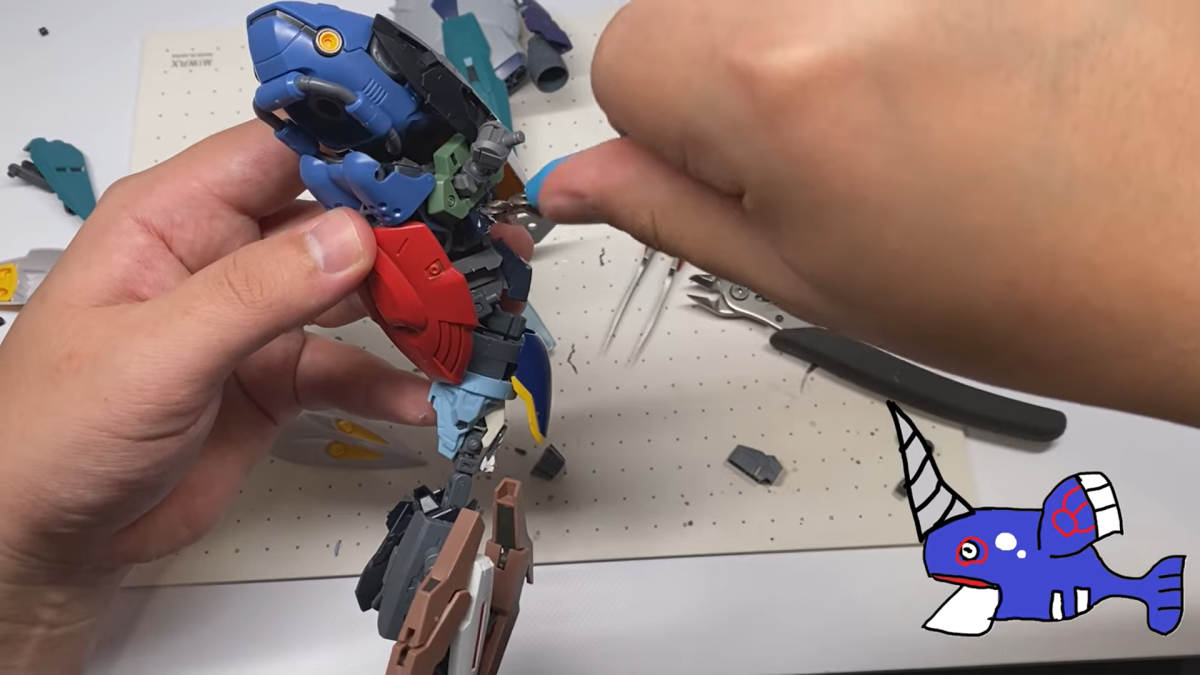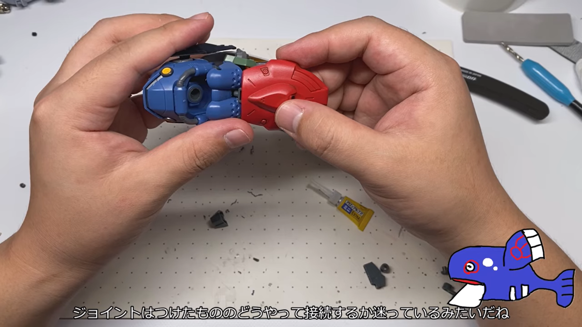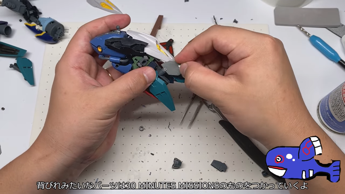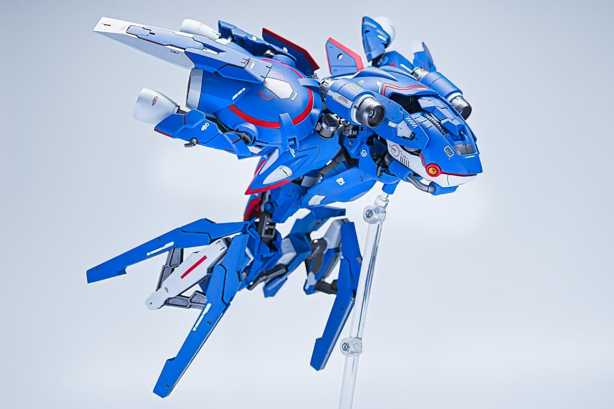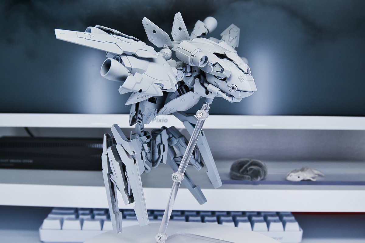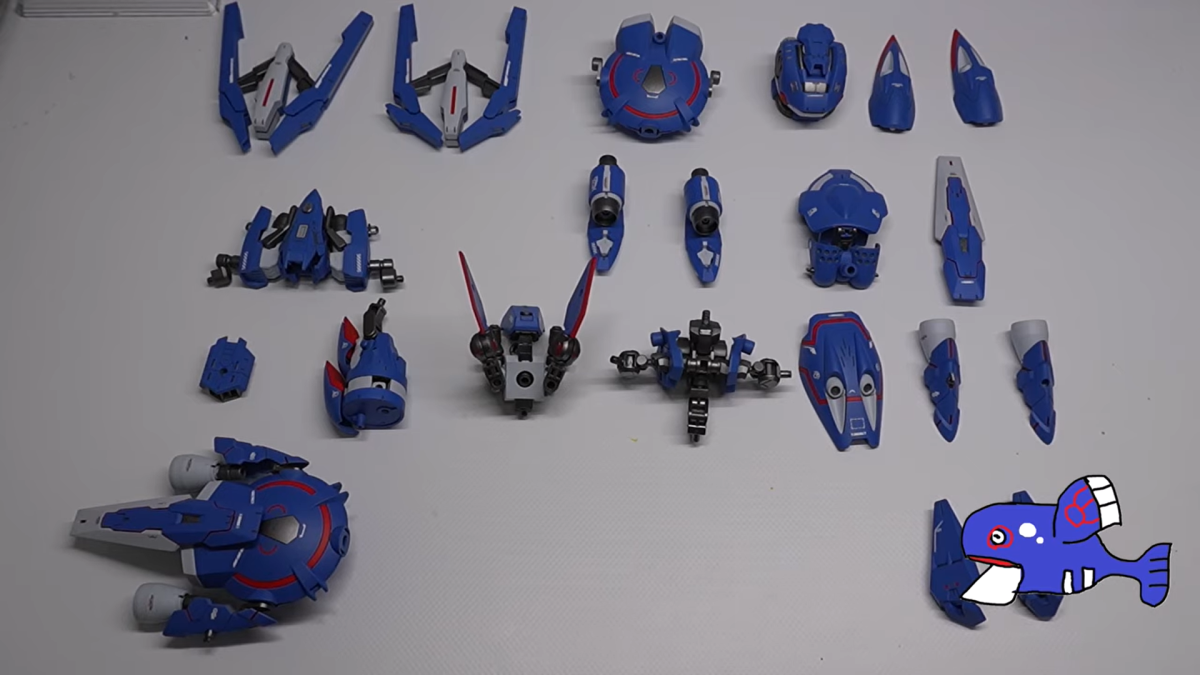 這次同樣採用許多鋼普拉、30 MS 等模型的各部零件,透過不斷的嘗試組裝,由於蓋歐卡並非是人型,要帶有一點機械獸的味道,只能透過挑選適合的組件來配置,這方面可讓ポポゴリラ費盡苦思。