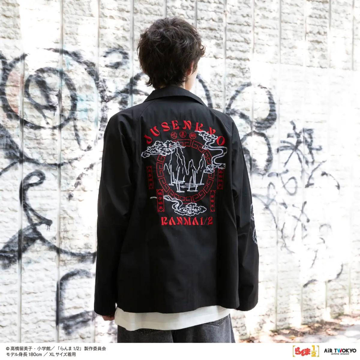 背後大面積刺繡上「咒泉鄉」,以精密刺繡呈現,甚至雙手手臂都有角色刺繡圖案點綴。